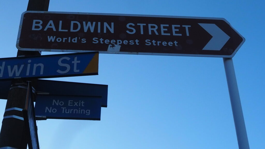 The steepest street is in the world – Baldwin Street in Dunedin. It is the residential street with an incredible gradient. If you stand at the starting point of this steep section, it looks a towering wall. I found it so odd when a car was coming down towards me, as I could see its roof, rather than its front. It felt as if I was looking down on it from the sky.